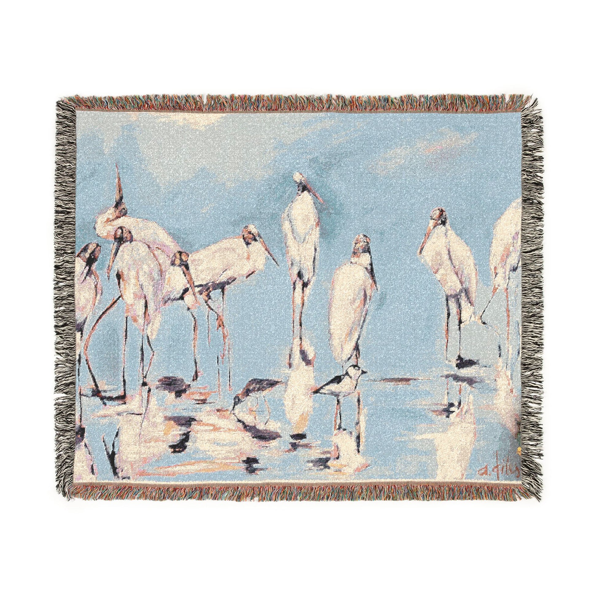 A one-of-a-kind A. GILES tapestry in coastal cool tones, where blues and soft neutrals create a calm, effortless elegance. Featuring a native wood stork design, this piece brings a refined nod to the coast while complementing any elevated coastal space. Style it draped over a chair or couch, or hang it as relaxed, artful wall décor. Perfect for gifting—or for keeping as a timeless coastal accent.